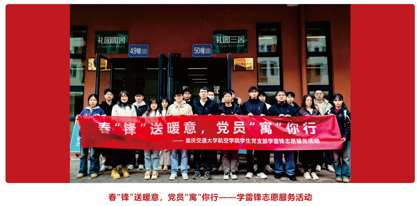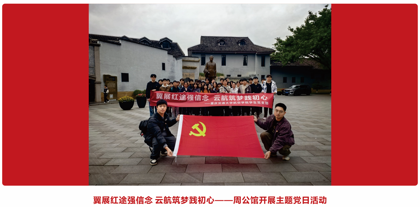 🏠 党支部简介 重庆交通大学航空学院学生党支部现有党员48名。支部始终坚持以立德树人为根本,以航空报国为理念,秉承"党建引领团建,五育融合育人"的工作思路,致力于培养高素质党员,服务广大师生。支部定期组织理论学习、志愿服务和社会实践,不断提升党员综合素质。近年来,在各项党建活动中取得显著成效,获得广泛认可,累计荣获包括第十七届全国大学生节能减排社会实践与科学竞赛特等奖、第四届全国高等学校航空航天类专业本科毕业设计成果交流会特等奖在内的省部级奖项100余项。 🔴 功能定位 支部紧密围绕"翼展红途,云航筑梦"的品牌理念,着力发挥以下核心功能: 思想引领核心:强化理论武装,筑牢党员理想信念根基。 组织建设堡垒:规范组织生活,提升支部凝聚力和战斗力。 党员成长熔炉:搭建实践平台,促进党员德智体美劳全面发展。 师生服务先锋:密切联系师生,解决实际困难,发挥模范带头作用。 桥梁纽带枢纽:畅通信息渠道,反映师生诉求,助力学院发展。 ☀支部活动