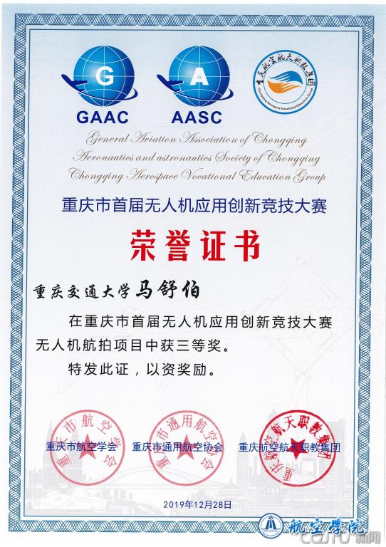 12月28日,由重庆通用航空协会,重庆市航空学会和重庆航空航天职教集团联合举办的首届“重庆市首届无人机应用创新竞技大赛”, 在重庆航天职业技术学院江津校区举办。来自重庆大学、重庆交通大学等12所高校参赛队伍同台竞技。我校参赛队伍发挥出色,最终斩获市级二等奖1项、三等奖1项。