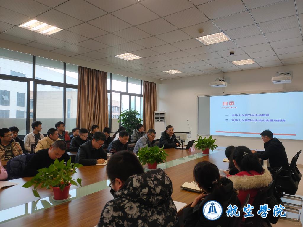赵明阶副校长首先号召全体教职工,坚持以习近平新时代中国特色社会主义思想为指引,增强“四个意识”,坚定“四个自信”,做到“两个维护”,把学习宣传贯彻党的十九届五中全会精神与抓好航空学院当前各项工作结合起来。