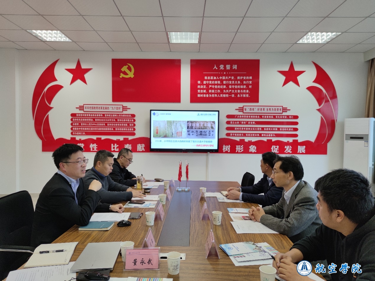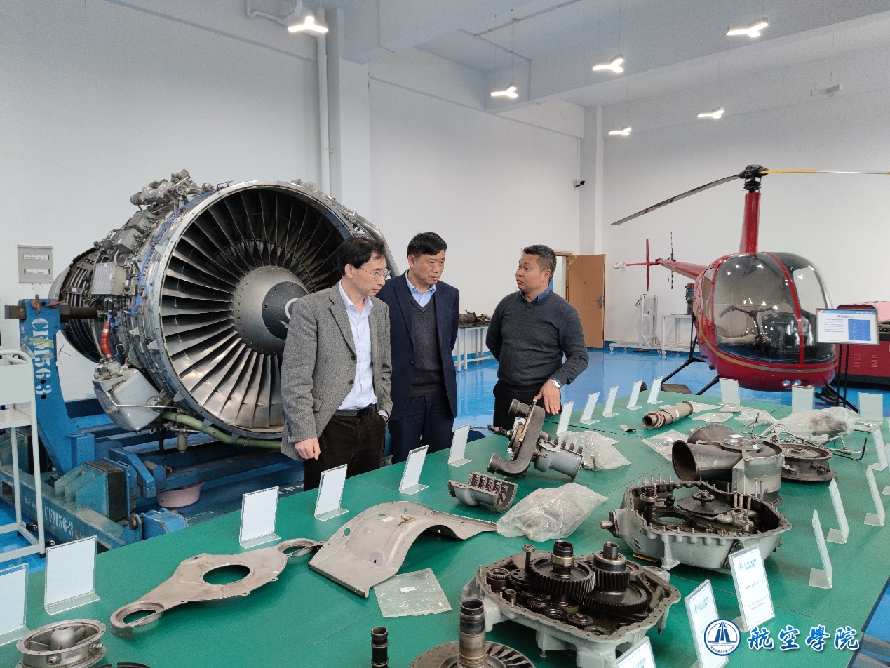 4月16日上午,黄冈师范学院机电与汽车工程学院院长程晓敏一行来校交流航空类专业办学经验,共同探讨航空类人才培养方案。黄冈师范学院机电与汽车工程学院副院长李智、汽车工程系主任赵欣迪;我校航空学院院长张铭、副院长邓涛、制造系主任任毅、对外合作与交流办公室主任董永武、航空工程实验中心张洪伦等参加交流座谈会。会议由张铭院长主持。