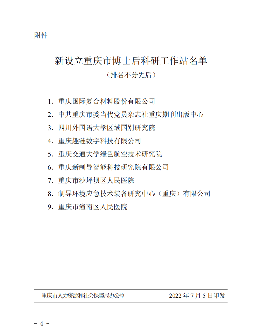 7月5日,重庆市人力资源和社会保障局办公室印发了《关于在重庆国际复合材料股份有限公司等 9 个单位设立市级博士后科研工作站的通知》(渝人社办〔2022〕188 号)。重庆交通大学绿色航空技术研究院获批设立市级博士后科研工作站。