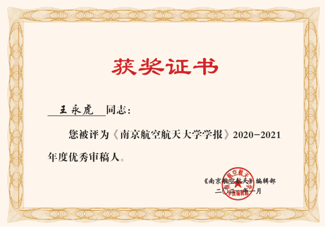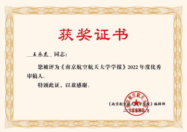 近日,《南京航空航天大学学报》编辑部向我校航空学院王永虎教授发来致谢信,感谢王永虎教授凭借深厚的专业知识对送审稿件给出了中肯的指导和严格的把关,为该期刊学术质量稳步攀升提供了有力的保障。为此,编辑部特于2021年度和2022年度连续两年授予王永虎教授《南京航空航天大学学报》“优秀审稿人”称号。