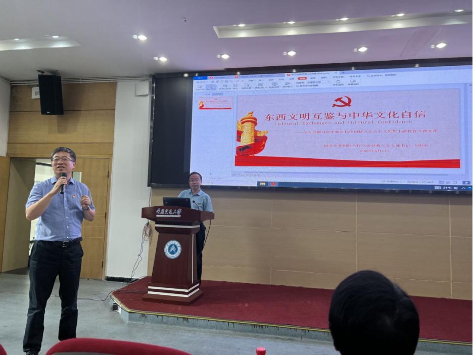 第三阶段,毛明勇做了题为《东西文明互鉴与中华文化自信》的党课宣讲。毛书记带领大家深入学习了习近平总书记在党的二十大报告中提出的“推进文化自信自强,铸就社会主义文化新辉煌”的要求,从对文化自信的态度、文化自信的来源、怎样坚定文化自信三个板块进行讲述,强调“推动中华优秀传统文化创造性转化、创新性发展”对于坚定文化自信、发展国家文化软实力的重要作用。