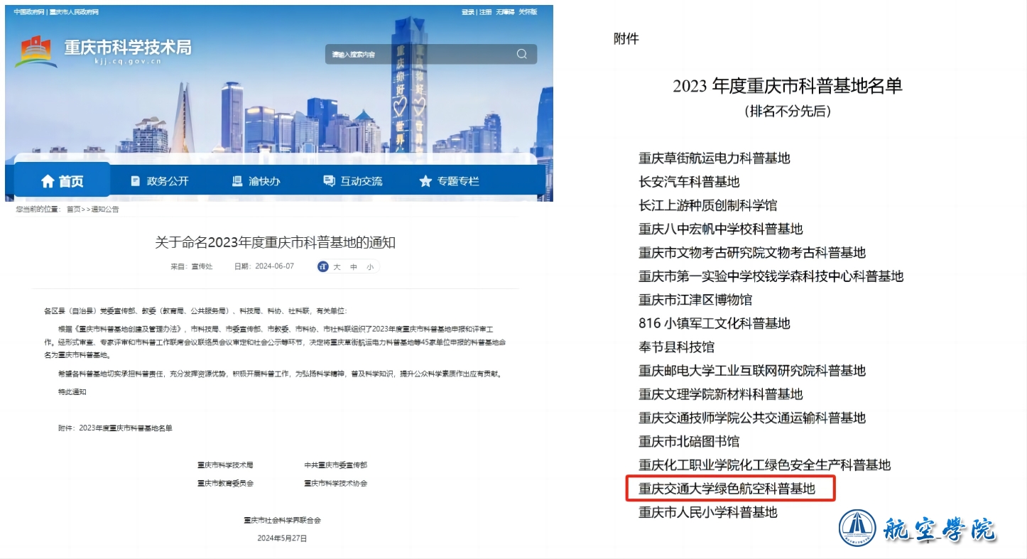 近日,重庆市科学技术局会同各有关单位,发布《关于命名2023年度重庆市科普基地的通知》,决定将包括重庆交通大学绿色航空科普基地在内的45家科普基地命名为重庆市科普基地。