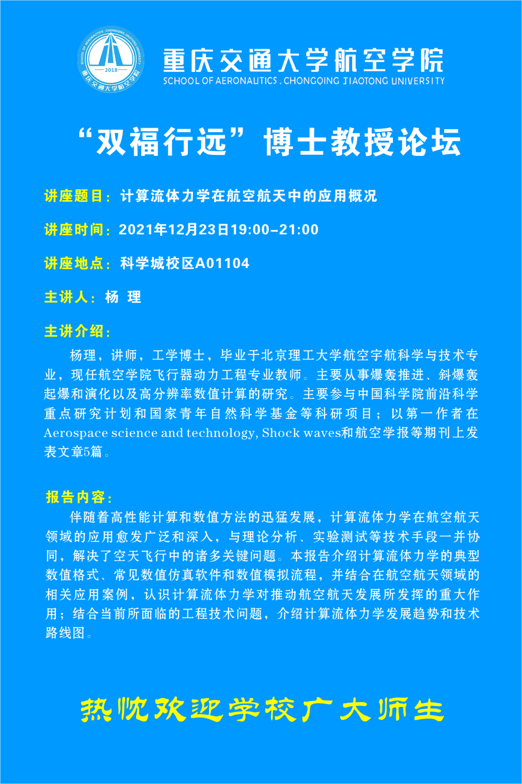 上一条:航空学院前沿微课:乘波体及其在高超音速领域的应用下一条:航空学院前沿微课讲座:航空复材结构性胶黏剂接头的强韧化设计