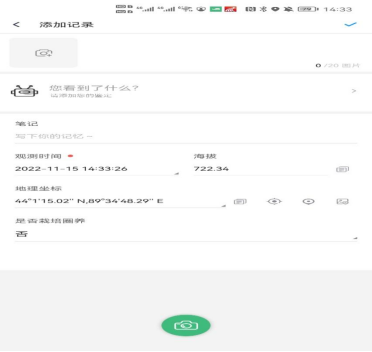 在记录项目里,需要记录“照片”、“看到了什么”、“笔记”,系统会自动输入“海拔”、“观测时间”、“地理坐标”。