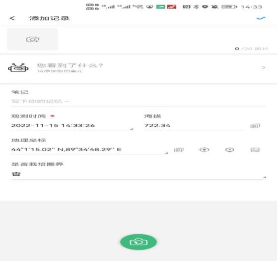 在记录项目里,需要记录“照片”、“看到了什么”、“笔记”,系统会自动输入“海拔”、“观测时间”、“地理坐标”。