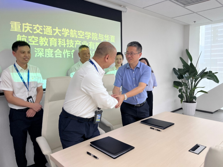 张铭院长和汤晓寒总经理分别代表重庆交通大学航空学院与华夏航空教育科技产业有限公司签署合作备忘录。会后,张铭院长一行在汤晓寒总经理等带领下参观了华夏航空教育科技产业园。
