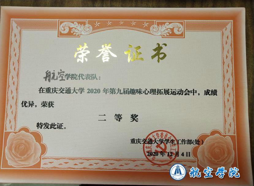 2020年12月5日下午,学校第九届趣味心理拓展运动会在双福校区足球场举行,活动由心理咨询中心主办,心理公益服务团协助。14个学院共计16支队伍参赛。我院代表队“航空护卫队”在趣味运动会中团结协作、配合默契,荣获二等奖。