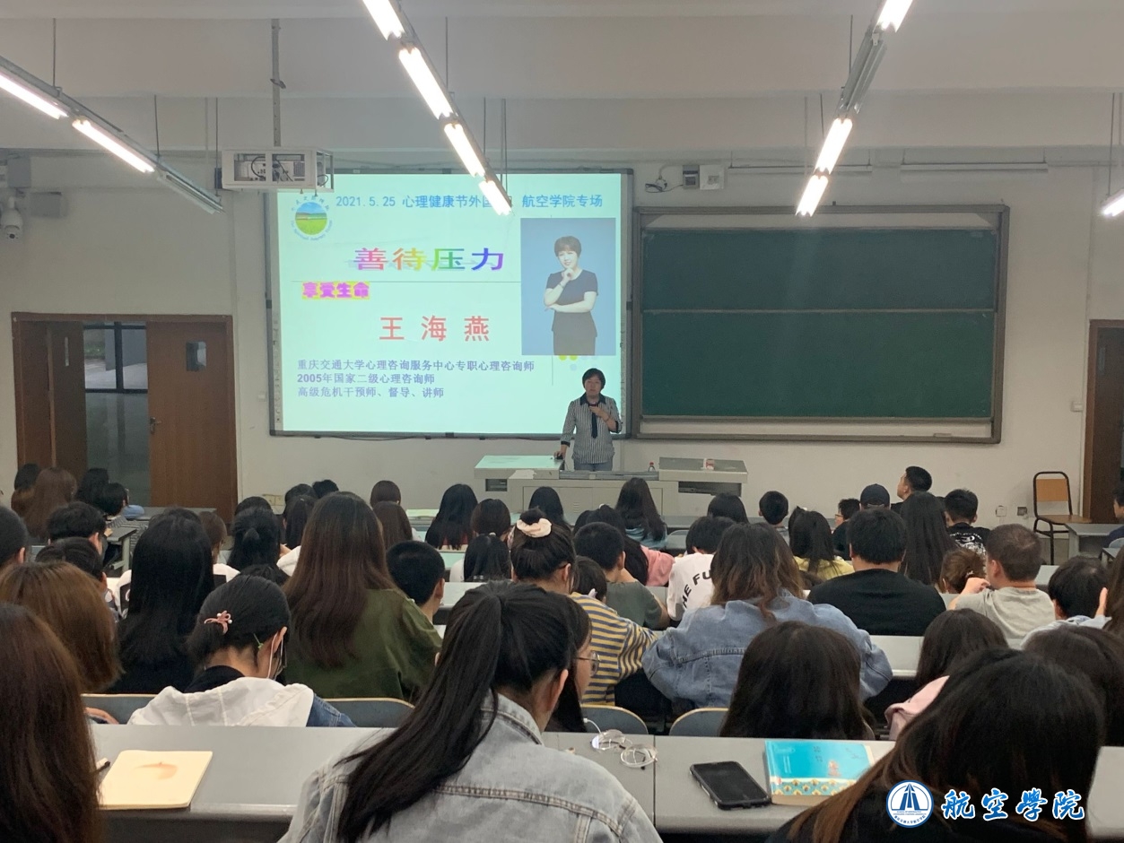 为进一步加强我院学生心理健康教育工作,帮助广大同学解决好情绪调节、环境适应、人格发展、人际交往、交友恋爱、择业就业等方面的困惑,增强心理调适能力,提高心理健康水平。2021年5月24日在A01-129教室,学校心理咨询服务中心王海燕老师做了题为《善待压力,享受生命》心理健康讲座。航空学院2019级,2020级学生100余人参加。