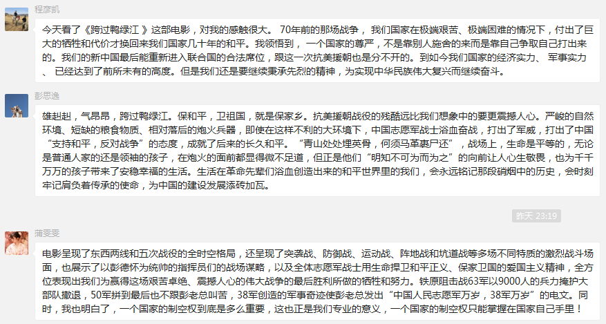 观影结束后,师生们都陷入了深深地沉思和感慨。大家纷纷表示,作为新时代青年人,要铭记历史、铭记英雄,传承红色基因。学生党员叶成渝表示,通过观看红色影片这种创新生动的学习方式,从党史中汲取奋进力量,热爱祖国人民,铭记光辉历史,在今后的学习不断增强使命感和责任感,一定好好学习,弘扬航空报国精神,进一步坚定实现中华民族伟大复兴的信心和决心。教职工代表耿雪梅表示,通过观看影片,志愿军战士不畏强权霸权、敢于斗争的精神深深触动了我,“饥无食、寒无衣”这六个字让我一次又一次热泪盈眶,深深地感染着在场的每一位同志。如今,硝烟已去,海晏河清,我们要牢记是先辈们抛头颅洒热血才换来了今天的和平盛世。发扬“能吃苦、肯奉献、创新进取”的精神,为教育事业的高质量发展贡献力量,以优异的成绩向党的二十大献礼!