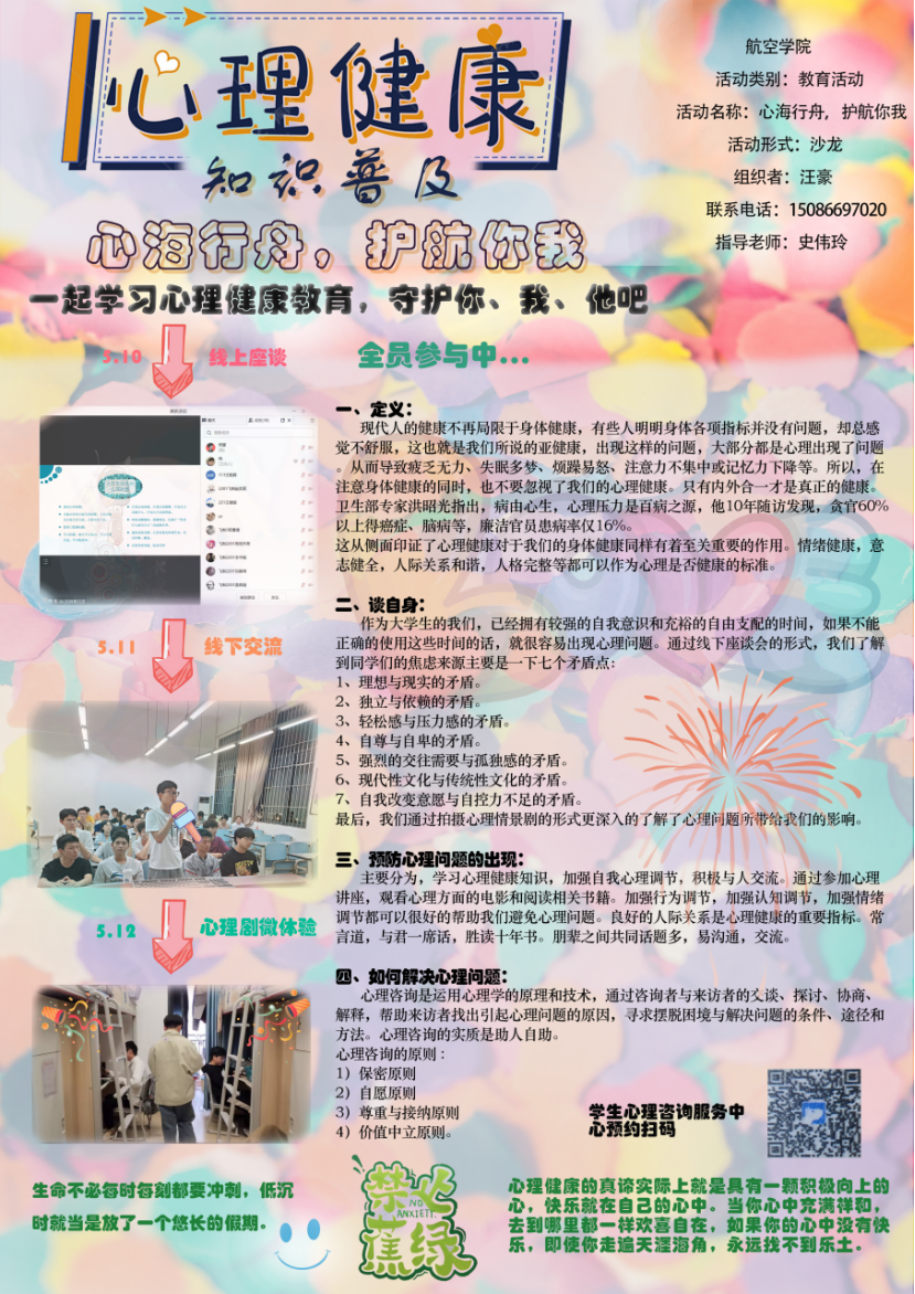 为迎接5.25全国大学生心理健康节的到来,进一步推进心理健康教育和生命教育,帮助大学生正确面对心理困扰和心理疾病,用科学有效方式自助助人,塑造大学生自尊自信、理性平和、积极向上的心态。航空学院特举办“和谐心灵,健康成才”心理主题成果征集活动。