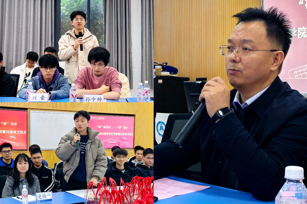 2024年11月19日下午16:00,航空学院在科学城校区航空楼208教室成功举办2025届毕业生考研慰问座谈交流会。本次座谈会以“‘研’途有你,一‘研’为定”为主题,旨在鼓励2025届考研学生在备考过程中相互支持,坚定信心,最终实现梦想。航空学院党委书记舒琳、院长何义团、党委副书记杨登陆、学科办主任林栎阳、学工办主任张小琴、2021级辅导员史伟玲、2024级研究生代表刘豪和孙中帅,以及2025届考研学生共同参加了此次座谈会。