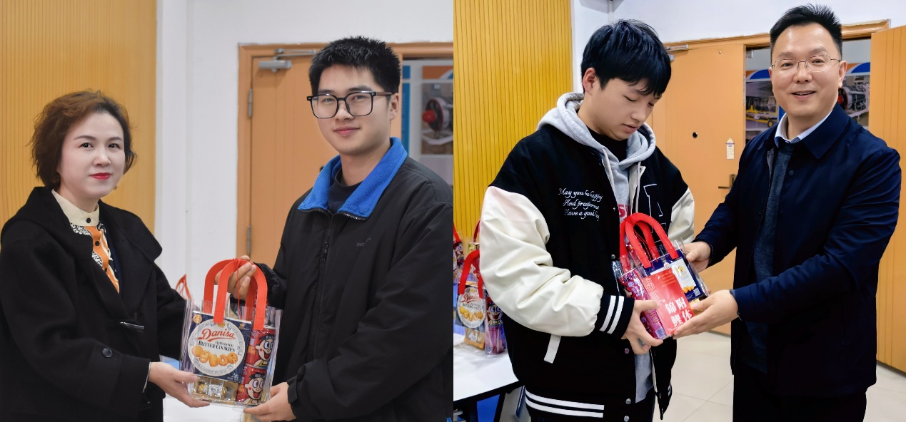 座谈会接近尾声时,舒琳书记和何义团院长亲手为每位参会学生发放了精心准备的慰问品,每件物品上都刻有学生的名字及“考研上岸”的美好祝福。这不仅是物质上的关怀,更是精神上的巨大鼓舞,让在场的每位同学都深刻感受到了来自学院的温暖和支持。